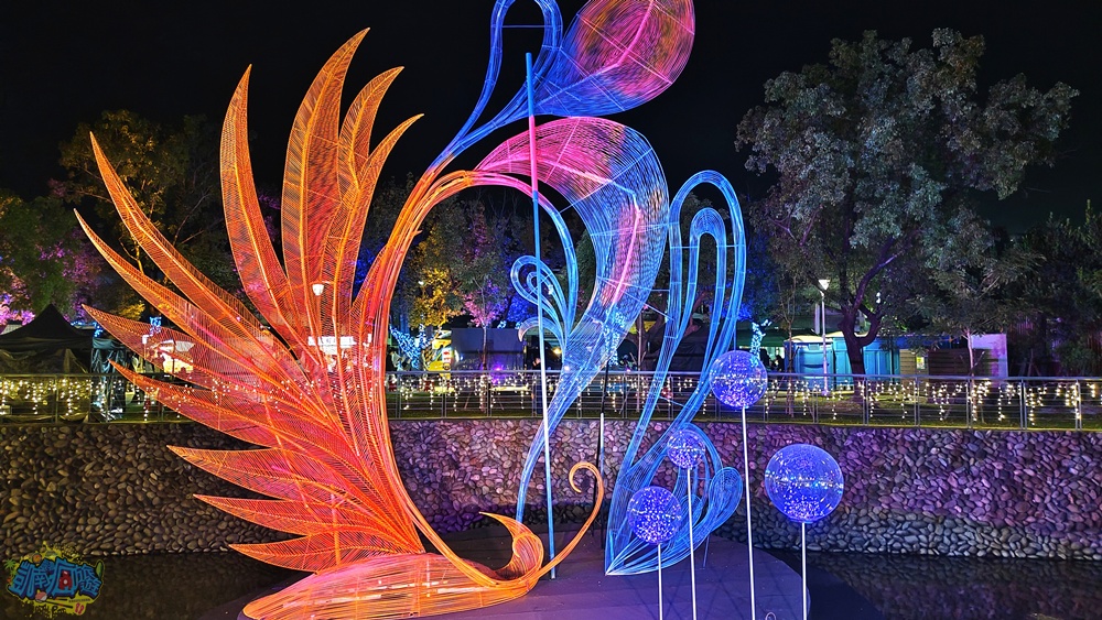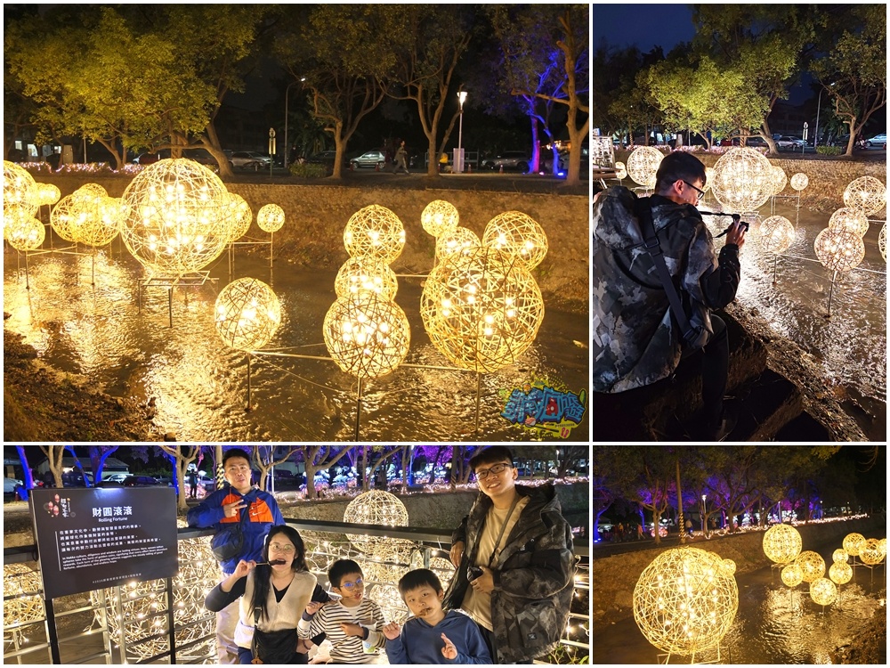 我個人很喜歡「財源滾滾」燈飾,超級美麗的藤球裝飾在龍頸溪畔的中央位置,此設計為傳承勤勞與智慧,將藤球化為象徵財富的金幣,也寓意著辛勤付出都將滾動出豐收的成果、無限的財富與希望。