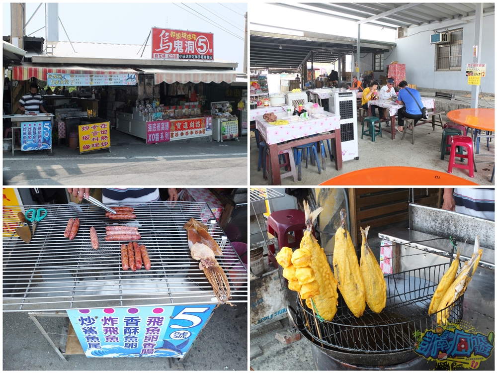 ▲非常低調的在地熱炒店【烏鬼洞五號餐館】,也稱烏鬼洞五號食堂,店前烤台上的現烤香腸發出陣陣香氣,還有金黃酥脆的炸飛魚,真夠美味!