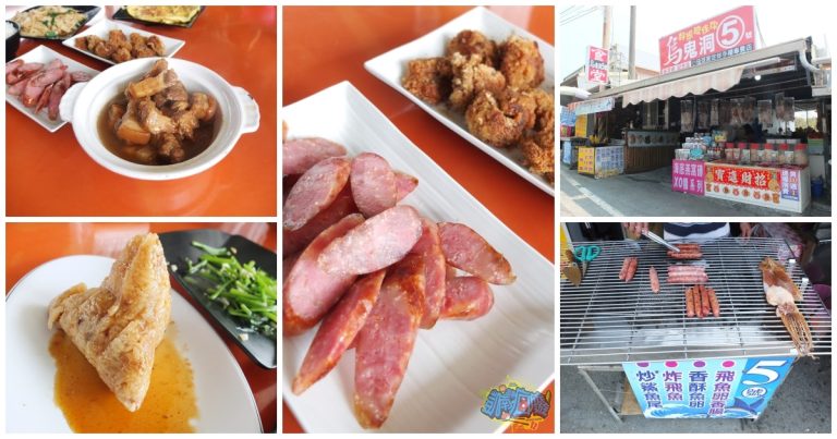 ▲非常低調的在地熱炒店【烏鬼洞五號餐館】,也稱烏鬼洞五號食堂,店前烤台上的現烤香腸發出陣陣香氣,還有金黃酥脆的炸飛魚,真夠美味!